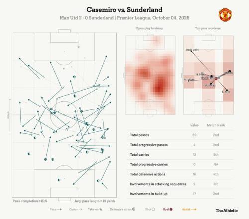 尽管司职防守型中场,但卡塞米罗在本场比赛中参与了5次进攻配合 —— 这一数据在曼联队内排名第三,且他在球队的进攻组织阶段发挥了关键作用。