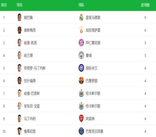 姆巴佩打进4球,直接导致欧冠射手榜大变,姆巴佩以9粒进球升上射手榜第1的位置。这也是姆巴佩职业生涯在单届欧冠最多的一次。奥斯梅恩以6粒进球排名第2。姆巴佩的两个非常强大的竞争对手哈兰德和凯恩在这一轮都没有进球,都被姆巴佩甩开了。
